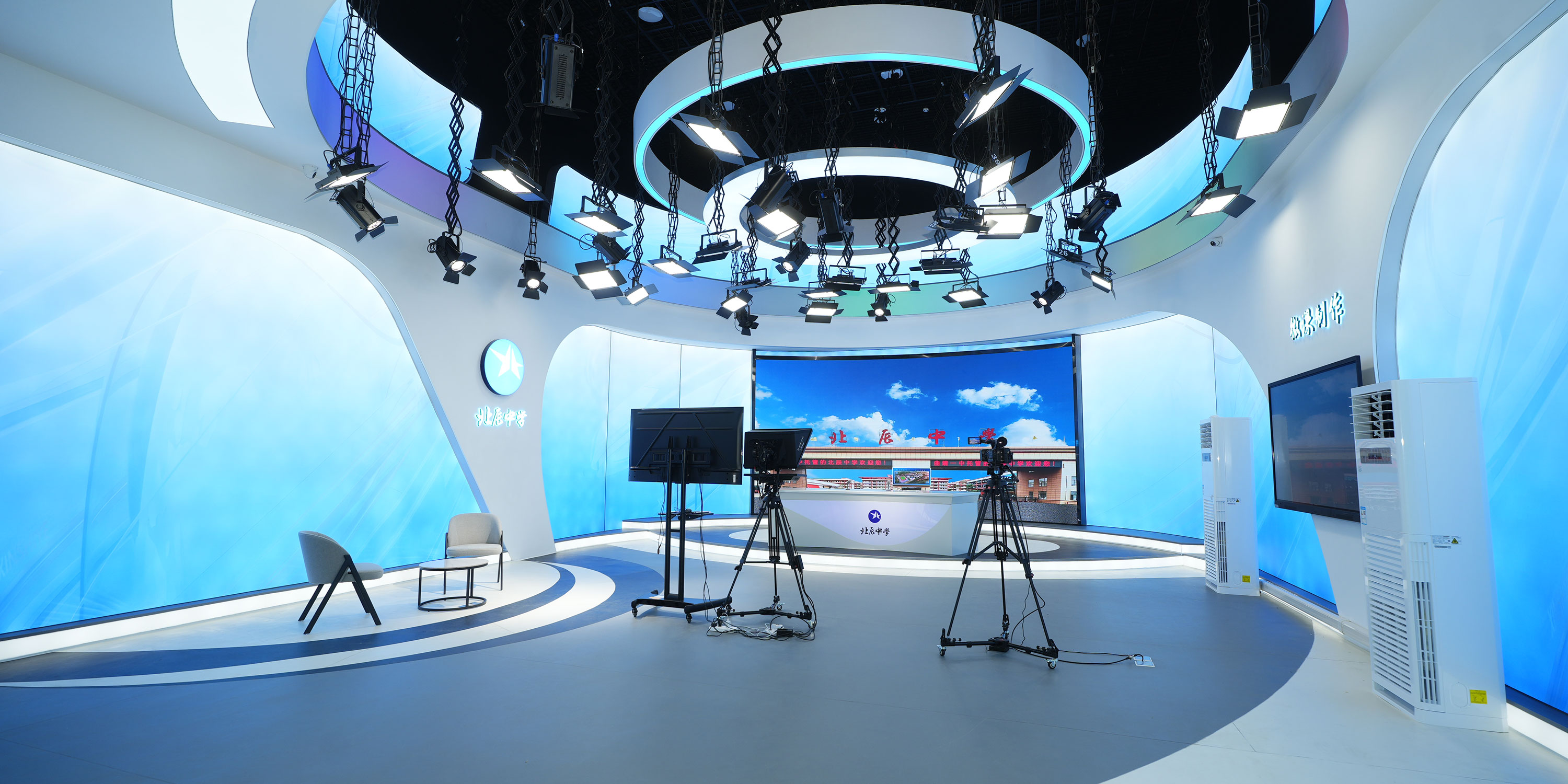 校园电视台由4K虚拟演播室系统、视频采集系统、非线性编辑系统、流媒体系统、现场监看、音频系统、LED灯光系统、蓝箱八大部分组成,是供学校自行拍摄、制作各种电视节目录像,如领导讲话、优秀示范课、教师访谈录、小型文艺节目、新闻节目等,并具有现场直播、录播、转播、转录等多种功能。